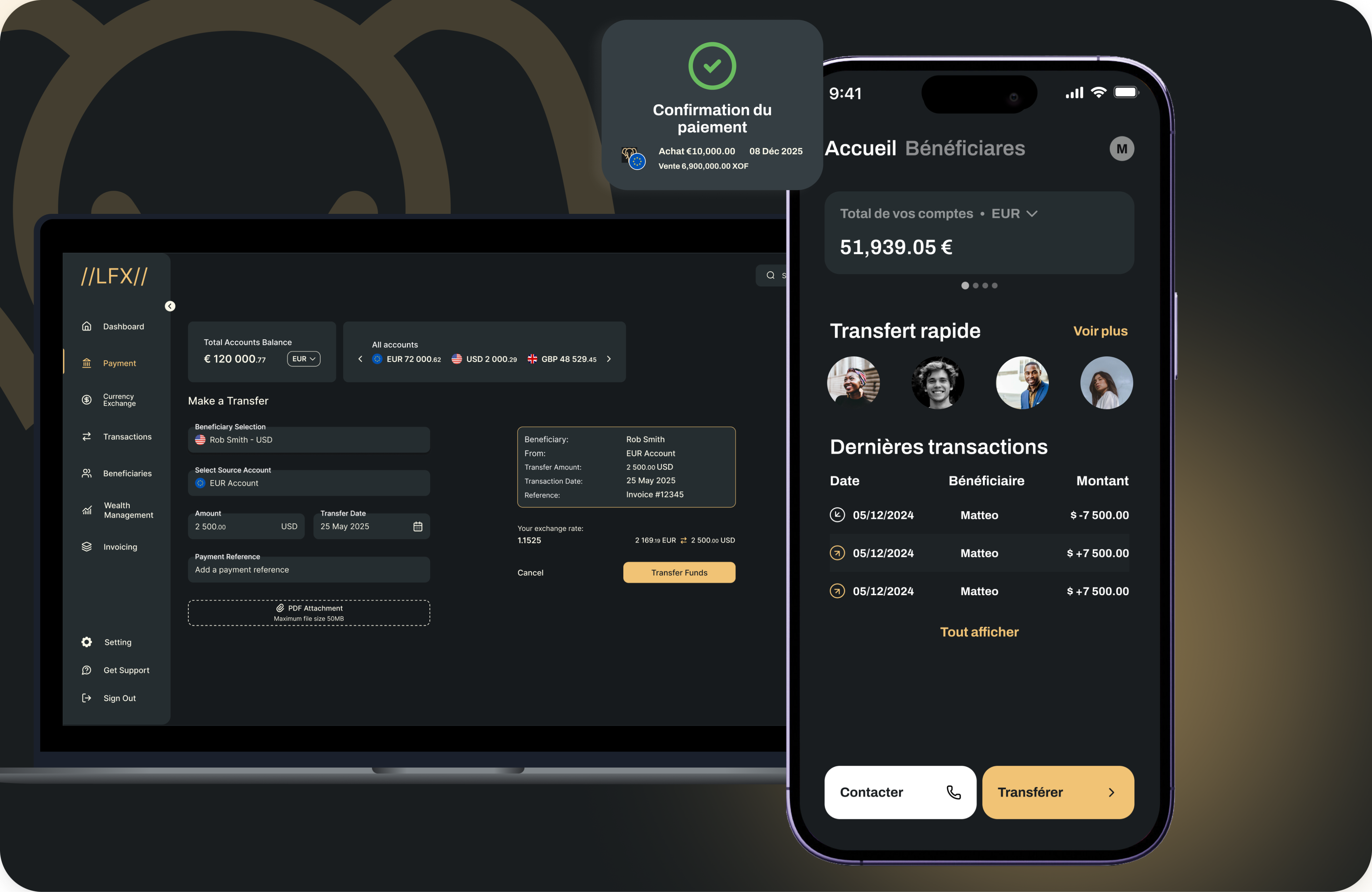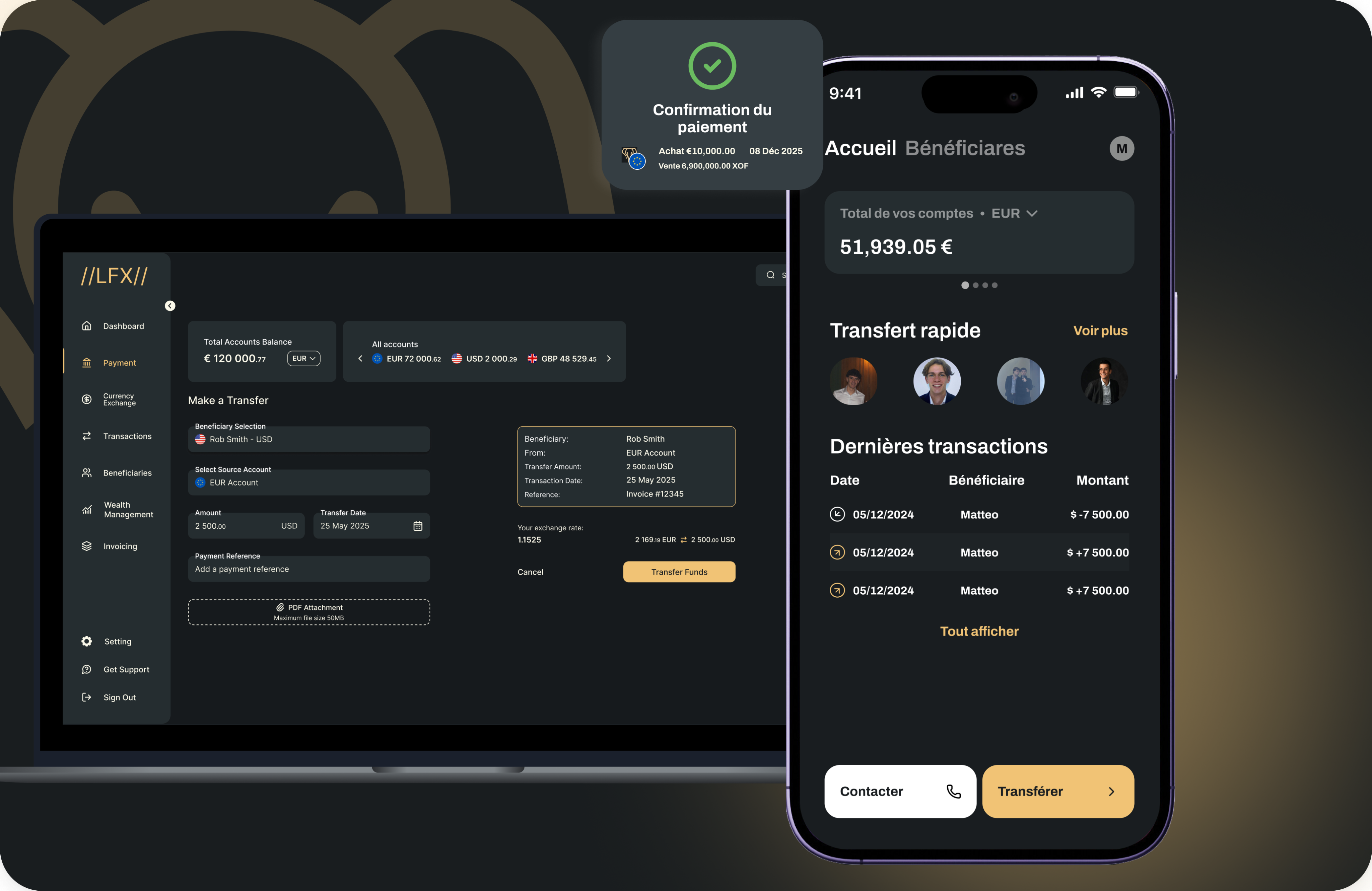 Effectuez vos paiements internationaux instantanément, au taux du marché.LFX garantit une exécution fluide, une transparence totale sur les taux et un suivi en temps réel de vos opérations.