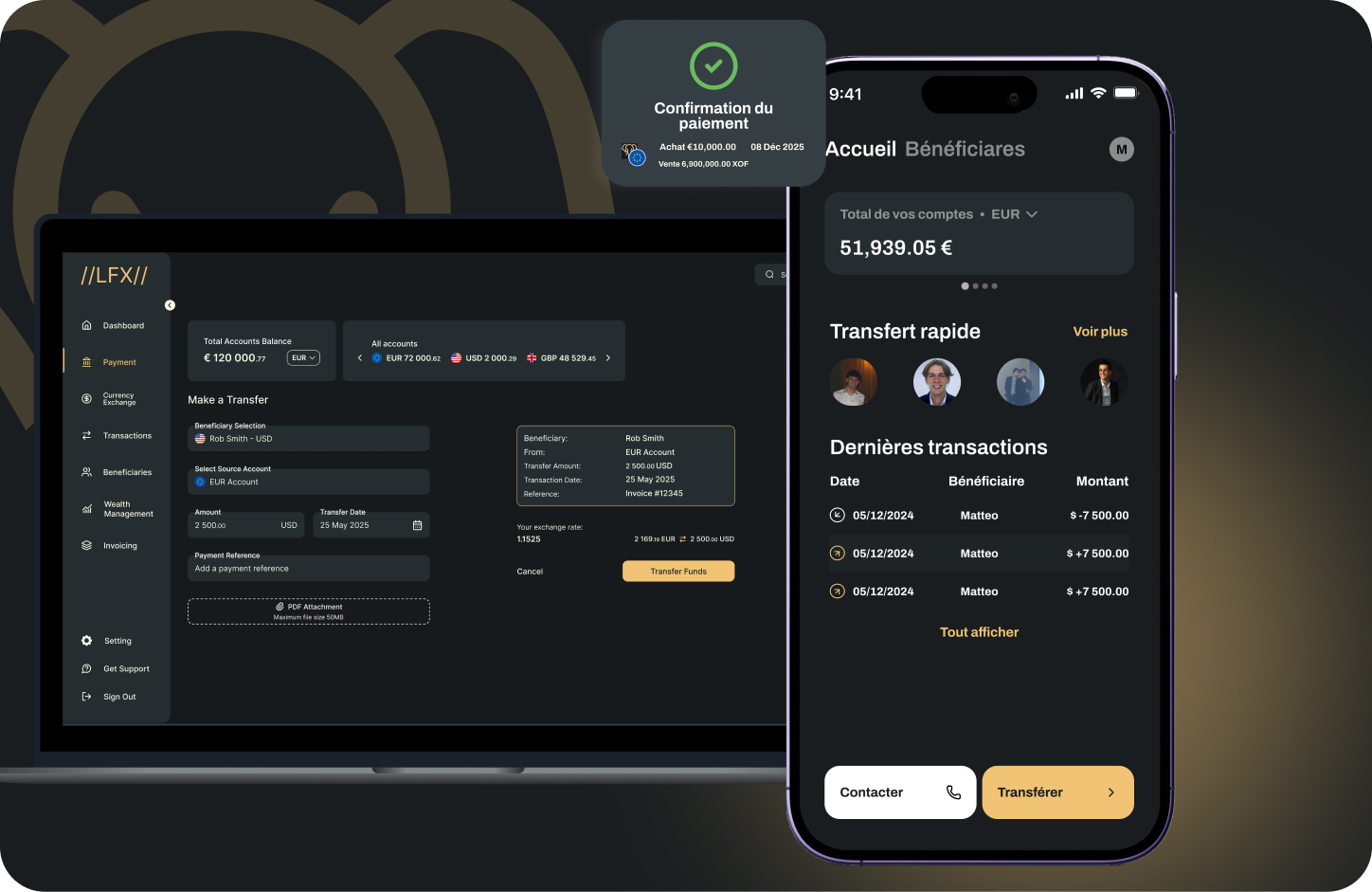 La plateforme LFX allie design épuré, sécurité de niveau bancaire et fluidité d’usage, accessible sur ordinateur ou mobile.Vous gardez le contrôle, où que vous soyez.